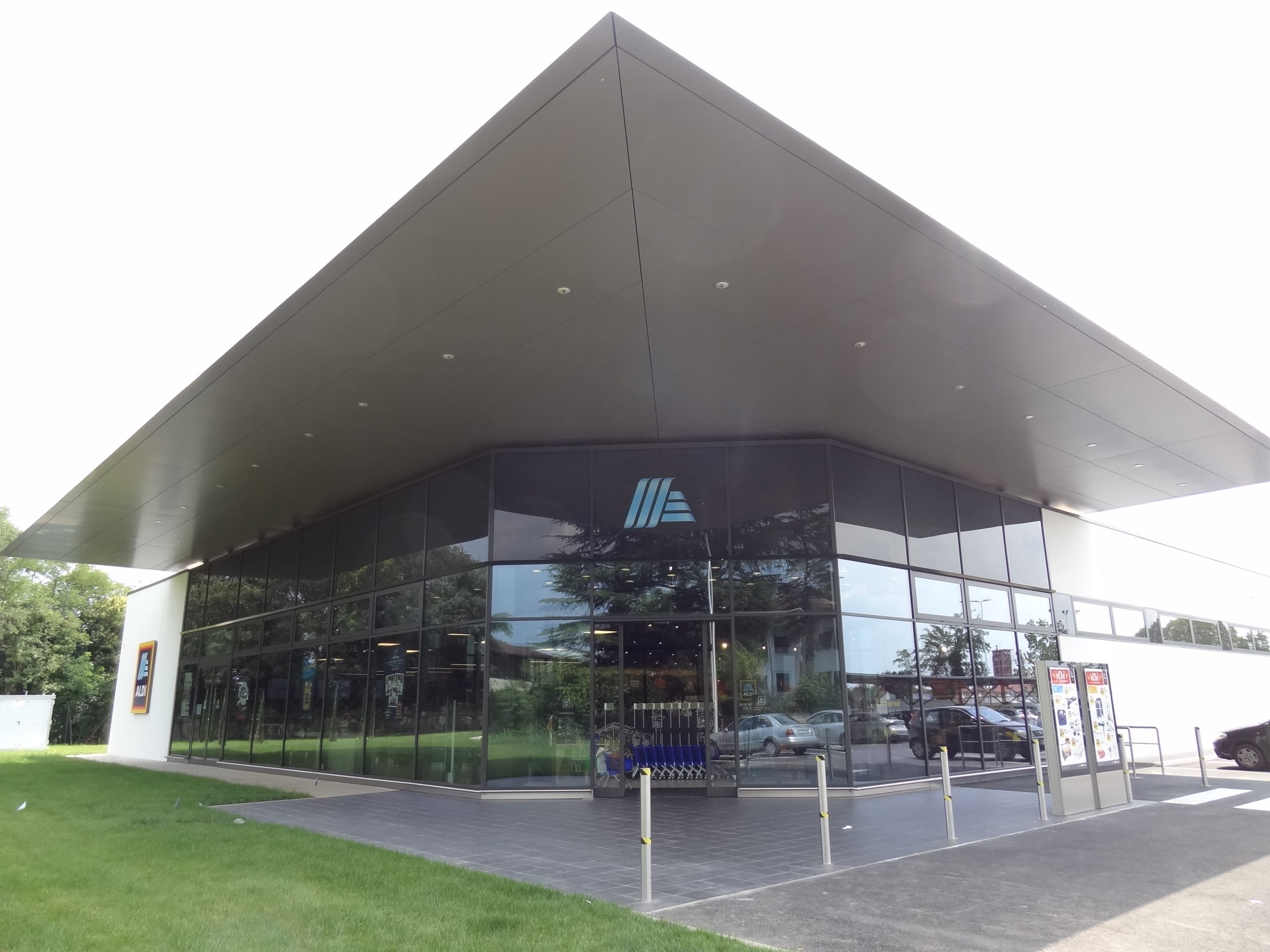 Med prvimi je bil odprt v Manzanu, kjer je Alu alprem izdelal vse zasteklitve na objektu in v notranjosti. V istem času smo izdelovali tudi elemente za Aldija v Reanu in Fidenzi. Na fasadi je kombinacija klasične fasade z nizkoenergetskimi stekli in strukturnimi izrivnimi okni. Notranji vetrolov je povsem steklen.